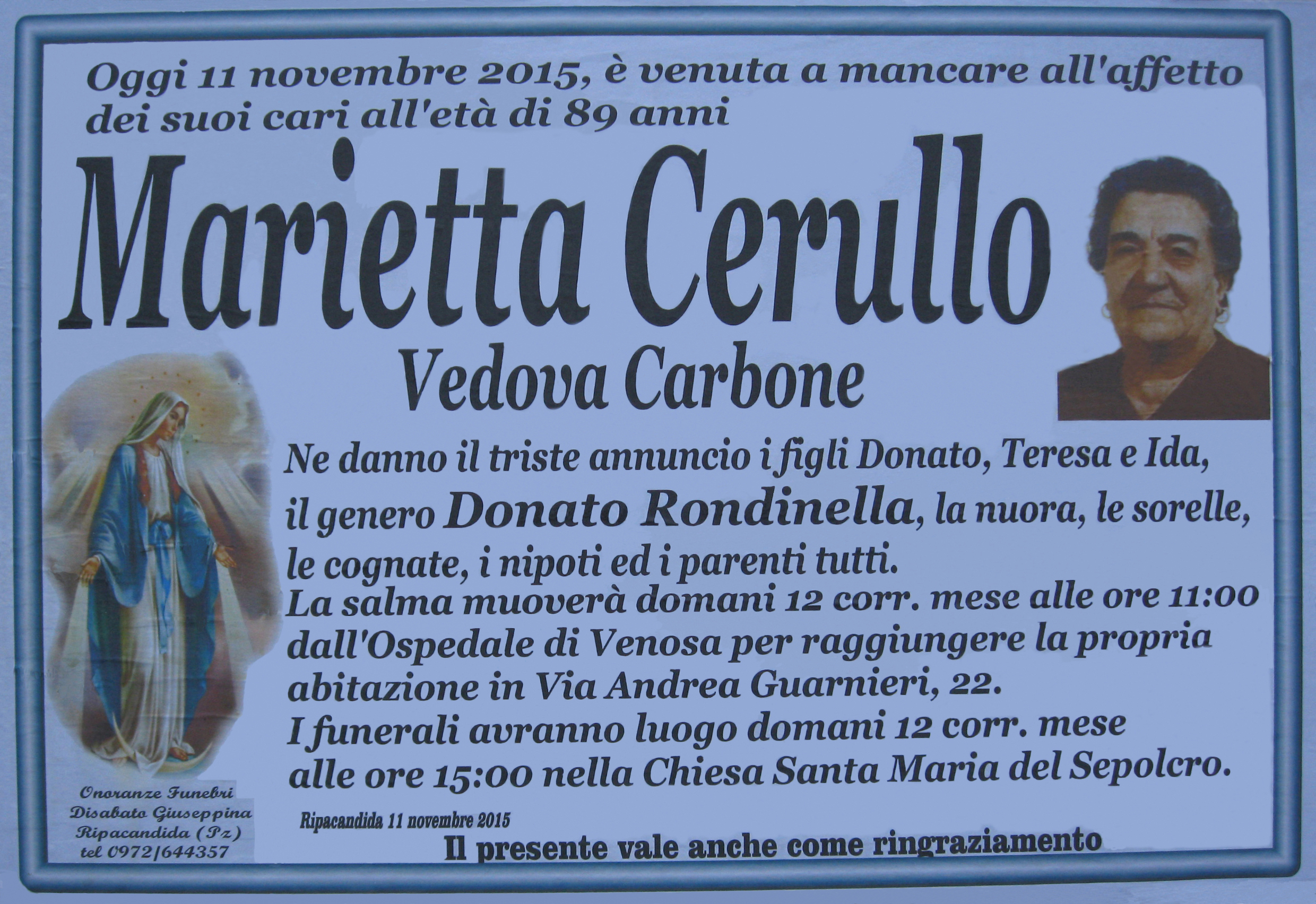 Mercoledì 11 Novembre 2015 Novembre 11, 2015Cronacaadmin Mercoledì 11 Novembre 2015 Viene a mancare Marietta CERULLO L’Associazione esprime il suo cordoglio e si associa al dolore dei familiari.