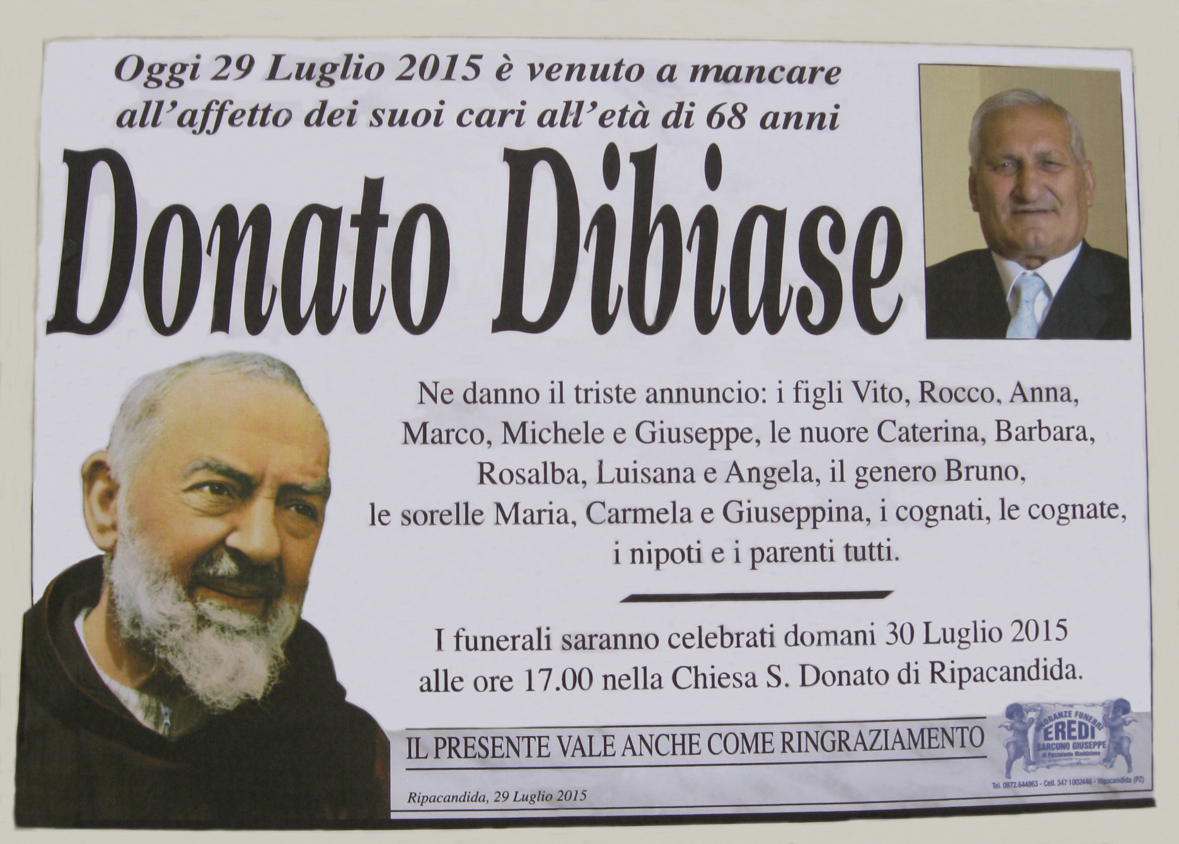 Mercoledì 29 Luglio 2015 Luglio 29, 2015Cronacaadmin Mercoledì 29 Luglio 2015 Viene a mancare Donato DIBIASE L’Associazione esprime il suo cordoglio e si associa al dolore dei familiari.
