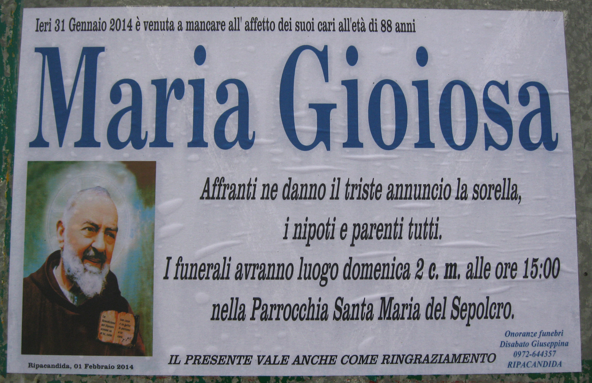 Venerdì 31 Gennaio 2014 Gennaio 31, 2014Cronacaadmin Venerdì 31 Gennaio 2014 Viene a mancare Maria GIOIOSA L’Associazione esprime il suo cordoglio e si associa al dolore dei familiari.