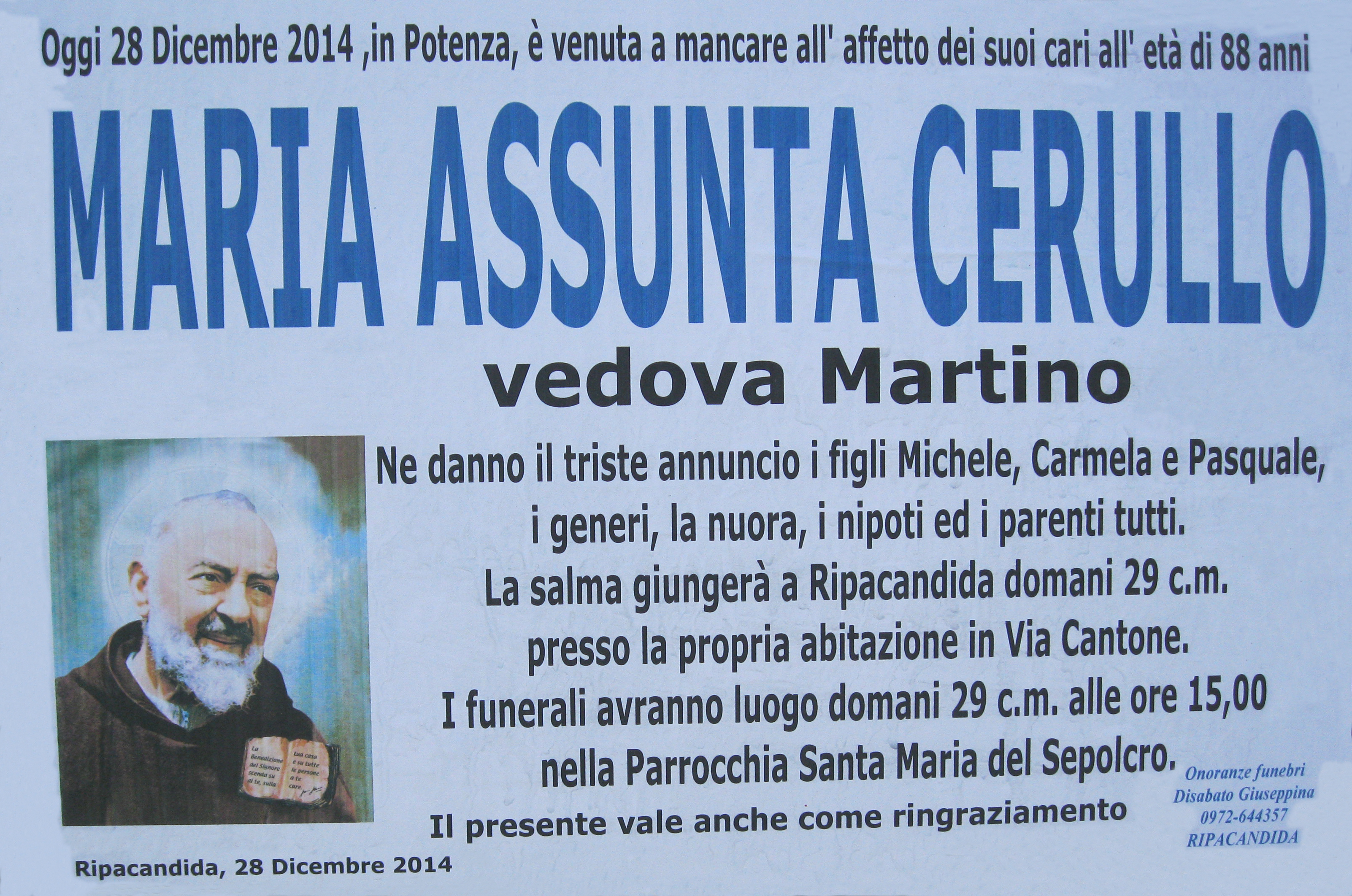 Domenica 28 Dicembre 2014 Dicembre 28, 2014Cronacaadmin Domenica 28 Dicembre 2014 Viene a mancare Maria Assunta CERULLO L’Associazione esprime il suo cordoglio e si associa al dolore dei familiari.