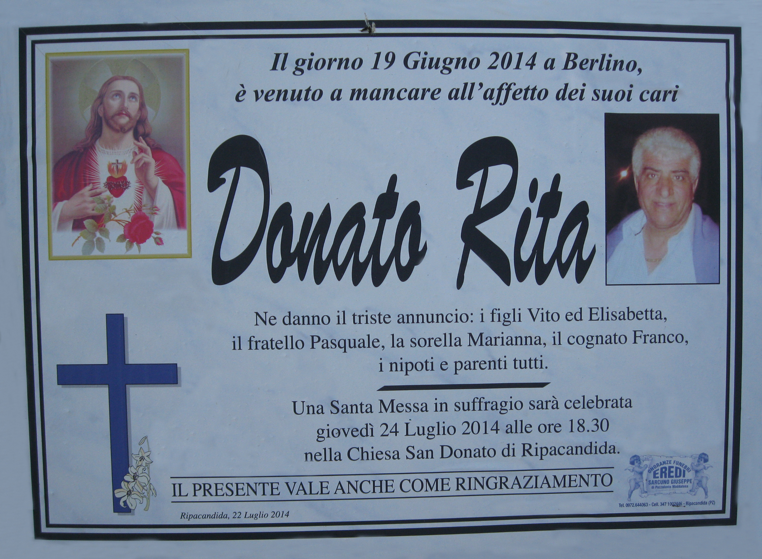 Giovedì 19 Giugno 2014 Giugno 19, 2014Cronacaadmin Giovedì 19 Giugno 2014 Viene a mancare Donato RITA L’Associazione esprime il suo cordoglio e si associa al dolore dei familiari.