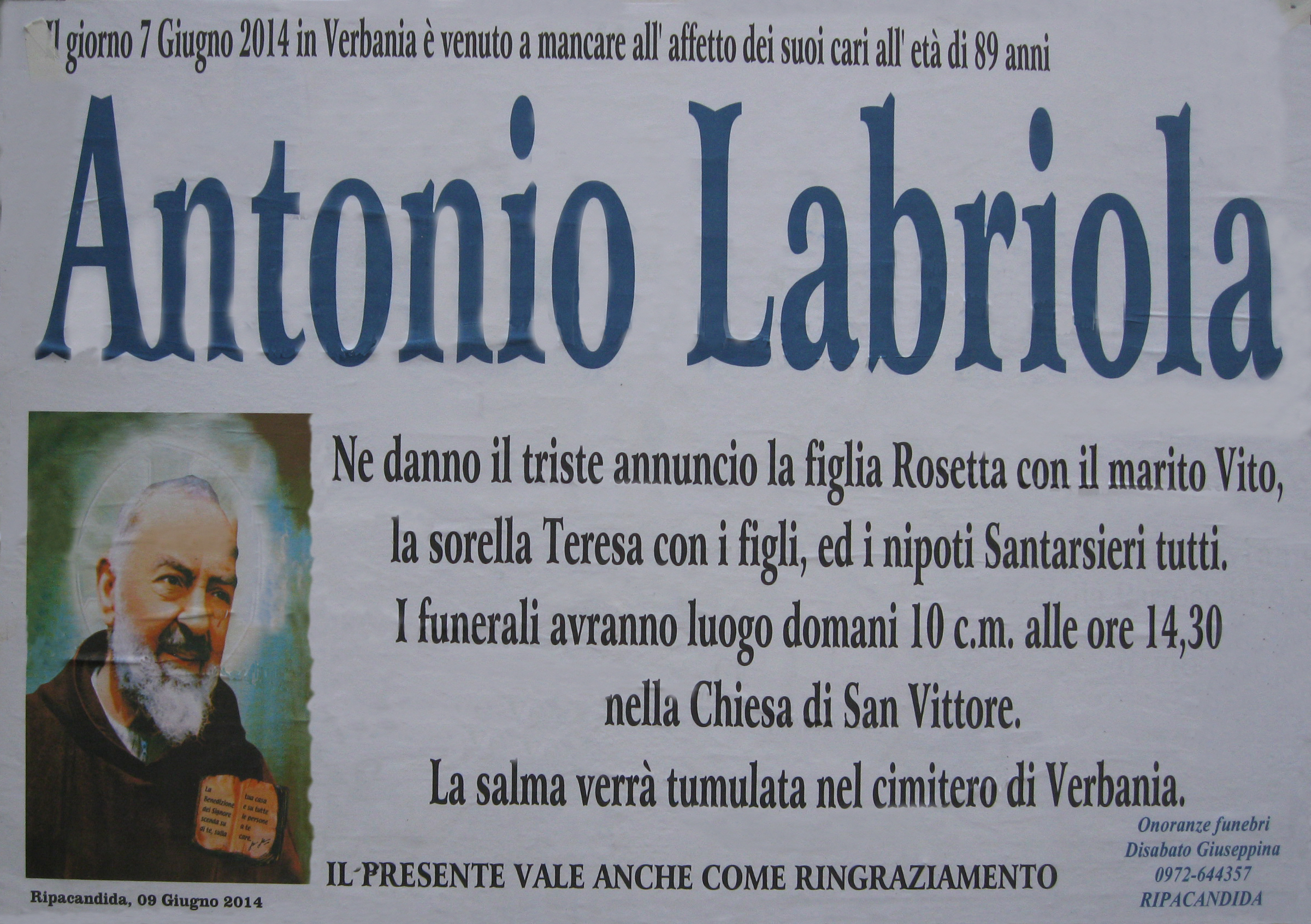 Viene a mancare Antonio LABRIOLA LABRIOLA ANTONIOL’Associazione esprime il suo cordoglio e si associa al dolore dei familiari.